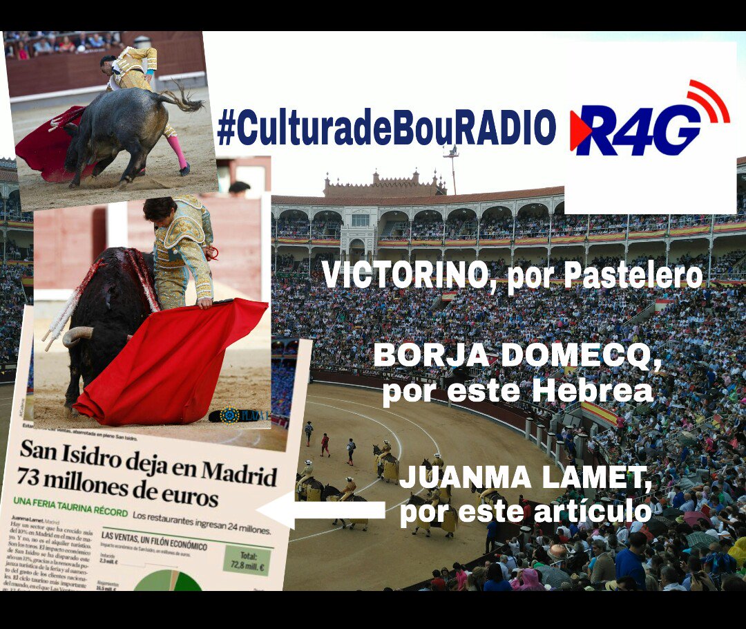Son protagonistas del Cultura de Bou de esta semana los criadores de 'Pastelero' y 'Hebrea', Victorino Martín y Borja Domecq Noguera (Jandilla), dos toros inolvidables que deja este San Isidro 2017. Además, también pasa por el programa el periodista del diario Expansión Juanma Lamet, que ha publicado hoy mismo huella económica que dejan 31 días continuados de toros en Madrid. CULTURA DE BOU es información, pasión y activismo por la Tauromaquia. Se emite todos los miércoles de 19 a 20 horas. Dirige y presenta ANDRÉS VERDEGUER TALÉNS.